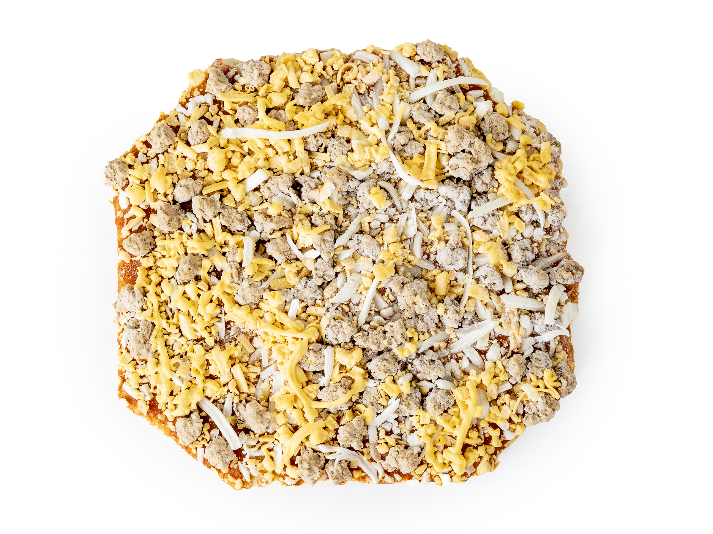 CRUST: Water, Whole Wheat Flour, Wheat Flour Enriched (Wheat Flour, Malted Barley Flour, Niacin, Reduced Iron, Thiamine Mononitrate, Riboflavin, Folic Acid), Soybean Oil, Sugar, Vital Wheat Gluten, Salt, Yeast, Enzymes. BEEF PATTY CRUMBLE: Ground Beef (No More Than 30% Fat), Water, Textured Vegetable Protein (Soy Protein Concentrate, Caramel Color), Textured Vegetable Protein (Soy Flour, Caramel Color), Salt, Spice, Sugar, Flavoring. SAUCE: Water, Tomato Paste (NTSS 31%), Seasoning (Spices Including Chili Pepper, Salt, Dextrose, Garlic, Less Than 2% Calcium Stearate Added To Prevent Caking), Soybean Oil, Xanthan Gum. CHEDDAR CHEESE: Cultured Pasteurized Milk, Salt, Enzymes, Annatto. LOW MOISTURE PART-SKIM MOZZARELLA CHEESE: Pasteurized Part-Skim Milk, Cheese Cultures, Enzyme, Natamycin.